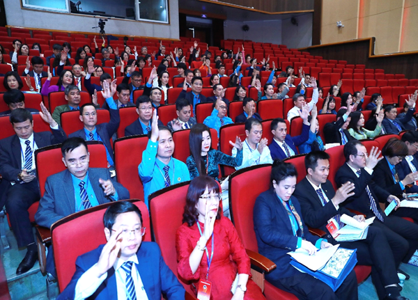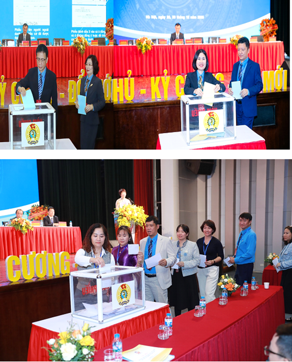 Đoàn Chủ tịch và các đại biểu tham gia bỏ phiếu bầu BCH CĐGD Việt Nam khóa XVII và bầu đại biểu đi dự Đại hội XIV Công đoàn Việt Nam