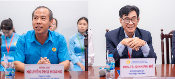 Đồng chí Nguyễn Phú Hoàng (Bên trái), Tỉnh ủy viên, Chủ tịch Liên đoàn Lao động tỉnh Lâm Đồng; Đồng chí Đinh Phi Hổ (bên phải), Bí thư Đảng ủy, Phó Hiệu trưởng Nhà trường