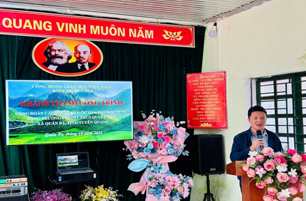 Đồng chí cũng cho biết, Khối thi đua số 1 trực thuộc Công đoàn Giáo dục Việt Nam, gồm 05 Công đoàn: Đại học Quốc gia Hà Nội, Đại học Quốc gia thành phố Hồ Chí Minh, Đại học Huế, Đại học Đà Nẵng và Đại học Thái Nguyên, theo kế hoạch Hội nghị giao ban Khối thi đua và hoạt động thiện nguyện tại Hà Giang được tổ chức vào đầu tháng 10/2025, tuy nhiên, do ảnh hưởng nghiêm trọng của bão số 11 (Matmo) gây ngập úng tại Thái Nguyên nên chương trình Hội nghị giao ban Khối thi đua và hoạt động thiện nguyện tại Hà Giang buộc phải hoãn lại. Vì vậy, trong dịp này, Công đoàn Đại học Thái Nguyên - đơn vị Khối trưởng Khối thi đua năm 2025 thay mặt các đơn vị trong Khối đến với thầy và trò Trường PTDTBT THCS Quyết Tiến nhằm tiếp nối tinh thần sẻ chia, thể hiện trách nhiệm xã hội của tổ chức công đoàn trong việc đồng hành cùng giáo dục vùng khó khăn.