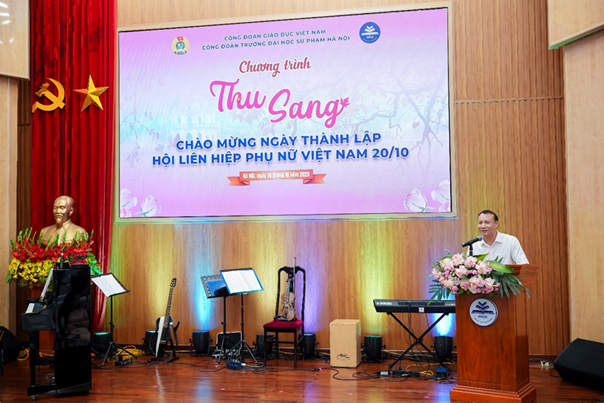 TS Cao Tuấn Anh - Chủ tịch Công đoàn Trường đã gửi lời chúc mừng tốt đẹp nhất tới nữ cán bộ, nhà giáo, người lao động của Trường - những người góp phần làm nên những thành tựu nổi bật của Trường Đại học Sư phạm Hà Nội trong sự nghiệp Giáo dục Việt Nam cũng như đóng vai trò quan trọng trong hoạt động công đoàn, đặc biệt là trong phong trào “Giỏi việc nước, Đảm việc nhà”; thành tích của nữ cán bộ đã góp phần tạo nên thành công. Đồng chí nhấn mạnh: Công đoàn Trường Đại học Sư phạm Hà Nội là một trong 20 tập thể tiêu biểu toàn quốc, đại diện cho Công đoàn Giáo dục Việt Nam vinh dự được Tổng Liên đoàn Lao động Việt Nam tặng Bằng khen thành tích xuất sắc trong phong trào “Giỏi việc nước, Đảm việc nhà” giai đoạn 2020 - 2025.