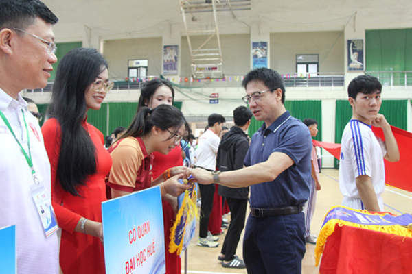 Ông Nguyễn Ngọc Ân - Chủ tịch Công đoàn Giáo dục Việt Nam trao cờ đăng cai giải đấu cho PGS.TS Trần Hữu Phúc - Chủ tịch Công đoàn Đại học Đà Nẵng.