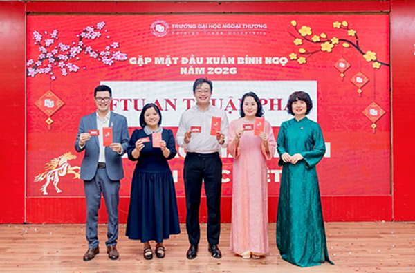 Trong không khí rộn ràng của những ngày đầu xuân Bính Ngọ 2026, sáng ngày 24/02/2026, Công đoàn Trường Đại học Ngoại thương đã phối hợp tổ chức Chương trình “Gặp mặt đầu xuân Bính Ngọ năm 2026” tại Hội trường D201, Trụ sở chính Hà Nội, đồng thời kết nối trực tuyến với Cơ sở II TP. Hồ Chí Minh và Cơ sở Quảng Ninh. Đây là hoạt động thường niên giàu ý nghĩa, mở đầu một năm mới bằng tinh thần gắn kết, sẻ chia và quyết tâm hành động, tạo nên khí thế phấn khởi trong toàn thể viên chức, người lao động Nhà trường.