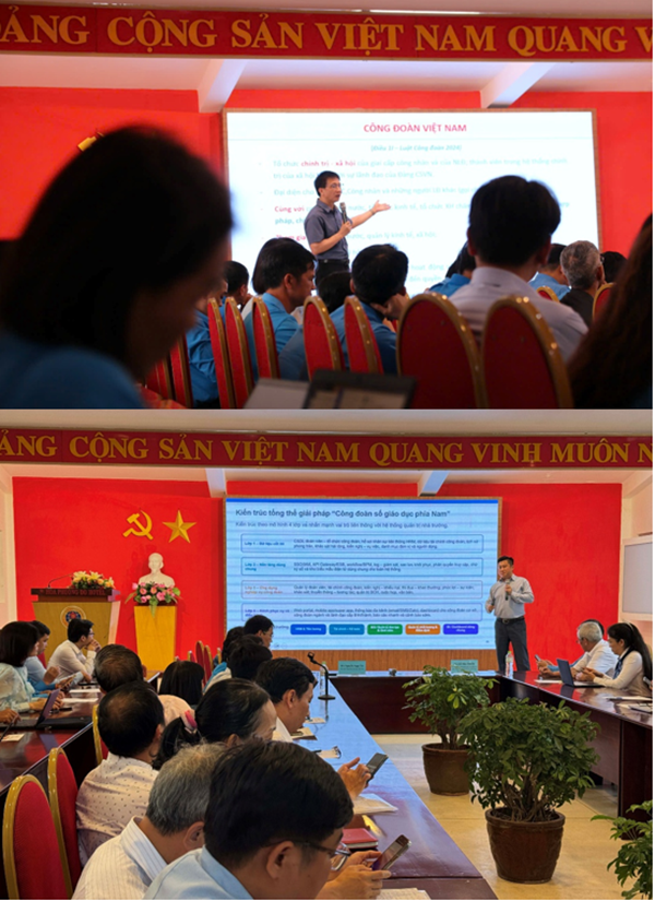 Trong chương trình, các đại biểu đã được nghe hai chuyên đề: “Vai trò của Công đoàn trong hệ thống giáo dục các tỉnh/thành phố phía Nam nhằm đáp ứng yêu cầu đổi mới và phát triển” do đồng chí Nguyễn Ngọc Ân trình bày và “Chuyển đổi số trong hoạt động công đoàn đáp ứng yêu cầu phát triển theo định hướng chung” do ông Nguyễn Hữu Quốc – Giám đốc điều hành Công ty TNHH Công nghệ Anh Quân trao đổi.