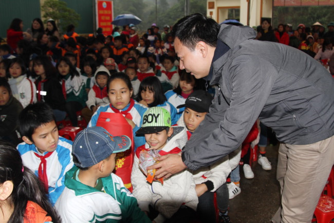Đ/c Vũ Minh Đức tặng quà cho 4 học sinh đang được đồn biên phòng Na Hình đỡ đầu