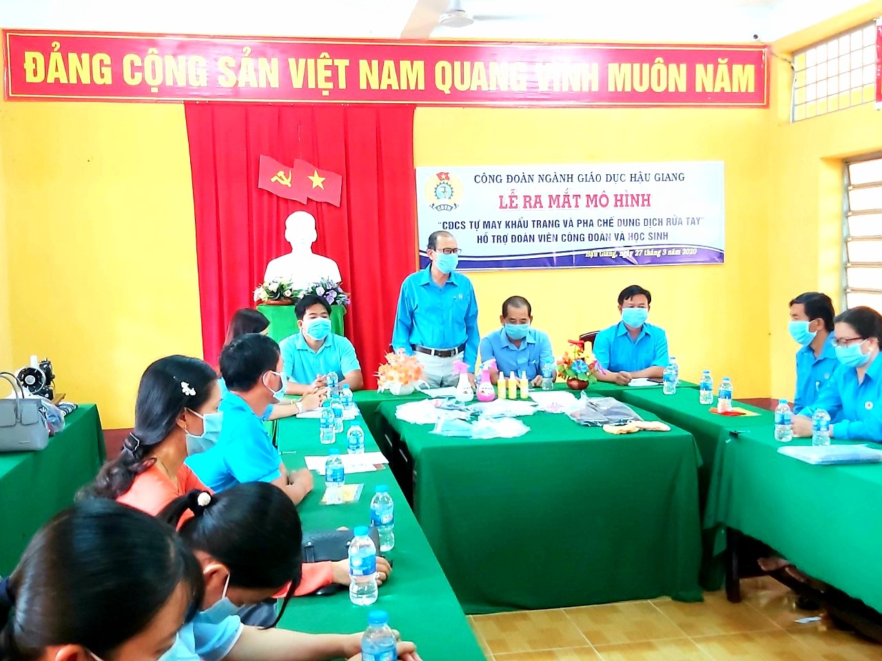 Trước tình hình diễn biến phức tạp của đại dịch Covid-19; nhằm chủ động thực hiện nhiều giải pháp phòng ngừa kịp thời mang lại sự yên tâm cho giáo viên, học sinh và niềm tin từ phụ huynh trong quá trình học tập tại trường khi học sinh đi học trở lại. Sáng ngày 27/3/2020, Công đoàn giáo dục (CĐGD) Hậu Giang tổ chức Lễ ra mắt mô hình “Công đoàn tự may khẩu trang, pha chế nước rửa tay” hỗ trợ đoàn viên công đoàn và học sinh phòng, chống dịch Covid-19.