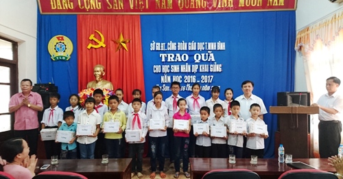 Thực hiện sự chỉ đạo của Bộ Giáo dục và Đào tạo, Công đoàn Giáo dục Việt Nam về việc chuẩn bị các điều kiện cho năm học mới, ngày 16/8/2016 Công đoàn Giáo dục Ninh Bình phối hợp với Lãnh đạo Sở Giáo dục và Đào tạo tặng 1000 suất quà (Mỗi suất 200.000đ) cho học sinh con gia đình chính sách, con gia đình có hoàn cảnh đặc biệt khó khăn, con gia đình thuộc hộ nghèo, hộ cận nghèo trong ngành giáo dục và đào tạo Ninh Bình nhân dịp năm học mới 2016 - 2017 với tổng số tiền trị giá 200 triệu đồng |