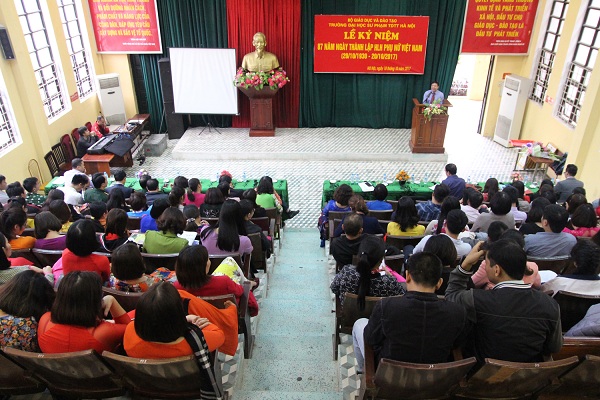 Diễn văn ôn lại truyền thống 87 năm Ngày thành lập Hội Liên hiệp Phụ nữ Việt Nam và 7 năm ngày Phụ nữ Việt Nam, đồng thời khẳng định vai trò của phụ nữ Nhà trường trong thời gian qua, ThS. Mai Thị Ngoãn - Trưởng Ban nữ công Trường cho biết: Dưới sự lãnh đạo, chỉ đạo của Đảng ủy- BGH, Công đoàn trường, Ban nữ công Trường đã giữ vững vai trò nòng cốt trong phong trào phụ nữ, không ngừng đổi mới nội dung, phương thức hoạt động nhằm phát huy mọi tiềm năng, sức sáng tạo của các tầng lớp phụ nữ, đóng góp quan trọng trên các lĩnh vực của đời sống xã hội, góp phần thực hiện nhiệm vụ phát triển nhà trường đáp ứng thời kỳ công nghiệp hóa, hiện đại hóa của đất nước và hội nhập quốc tế.