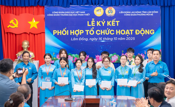 Trong không khí thi đua sôi nổi chào mừng Đại hội Công đoàn Trường Đại học Phan Thiết nhiệm kỳ 2025 – 2030 và Kỷ niệm 95 năm Ngày Phụ nữ Việt Nam (20/10/1930 – 20/10/2025), vào chiều ngày 16/10/2025, tại Trường Đại học Phan Thiết, Công đoàn Trường Đại học Phan Thiết và Công đoàn phường Mũi Né đã long trọng tổ chức Lễ ký kết phối hợp công tác, đánh dấu bước khởi đầu cho mối quan hệ hợp tác bền chặt giữa nhà trường và địa phương.