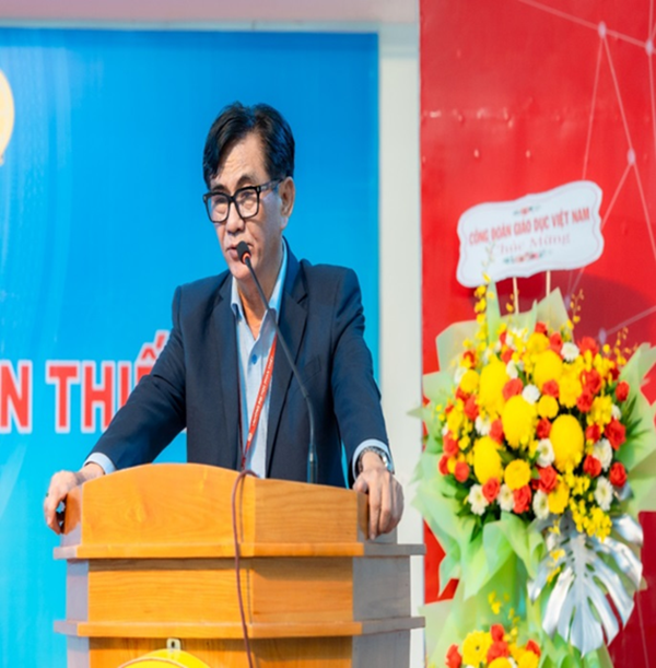 Đ/c Lâm Ngọc Điệp - Chủ tịch Công đoàn Trường trình bày diễn văn khai mạc và báo cáo tổng kết nhiệm kỳ 2023 - 2025