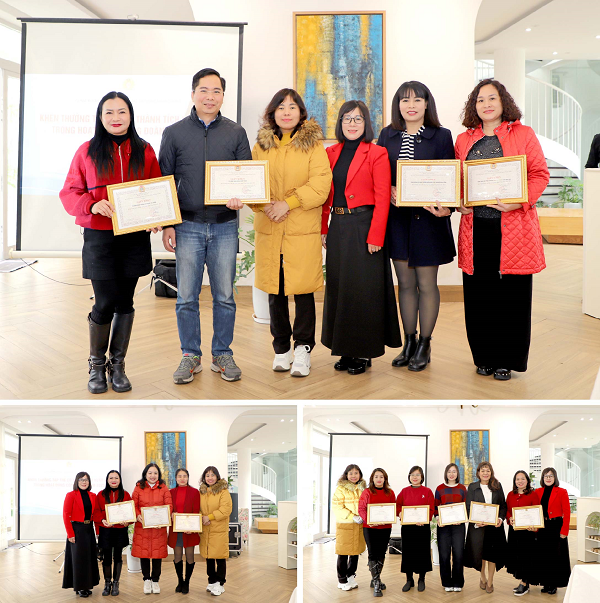 Đồng chí Nguyễn Thị Thanh - Bí thư Đảng ủy và Đồng chí Nguyễn Thị Thanh Nga - Chủ tịch Công đoàn Trường trao giấy khen cho 04 tập thể và các cá nhân có thành tích xuất sắc trong hoạt động Công đoàn năm 2025.