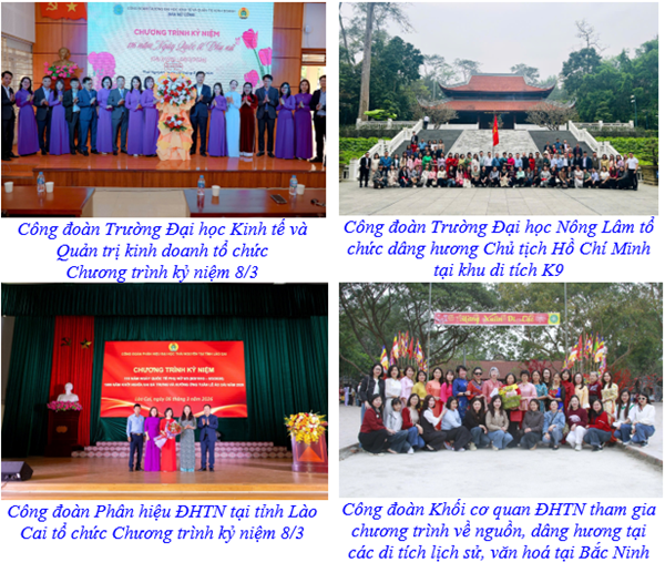 Một số hoạt động tiêu biểu có thể kể đến như chương trình “Trải nghiệm văn hóa Kinh Bắc” do Công đoàn Trường Đại học Sư phạm và Công đoàn Khối Cơ quan Đại học Thái Nguyên tổ chức; cuộc thi “Câu chuyện từ những loài hoa” kết hợp mít tinh chào mừng ngày 8/3 do Công đoàn Trường Đại học Kinh tế và Quản trị Kinh doanh triển khai;
