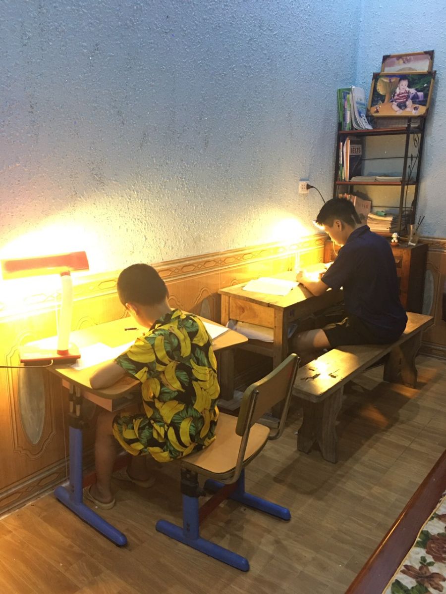 Hai con trai của cô giáo Phạm Thị Hà trong giờ học ở nhà.