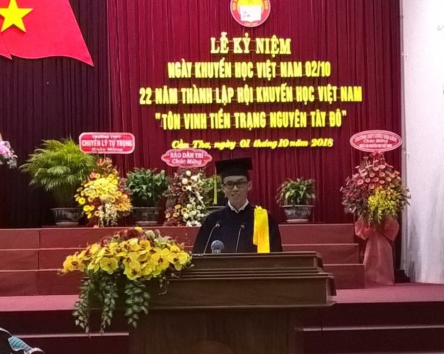 Thay mặt các sinh viên học sinh được nhận thưởng tại buổi Lễ kỷ niệm 22 năm ngày Khuyến học Việt Nam, em Nguyễn Tân Đông Phát, học sinh đỗ thủ khoa vào trường Đại học đã phát biểu bày tỏ sự tri ân đối với quý thầy cô, các bậc phụ huynh; đồng thời hứa sẽ quyết tâm phấn đấu hơn nữa trong thời gian tới để luôn xứng đáng với tình cảm, niềm tin của mọi người.