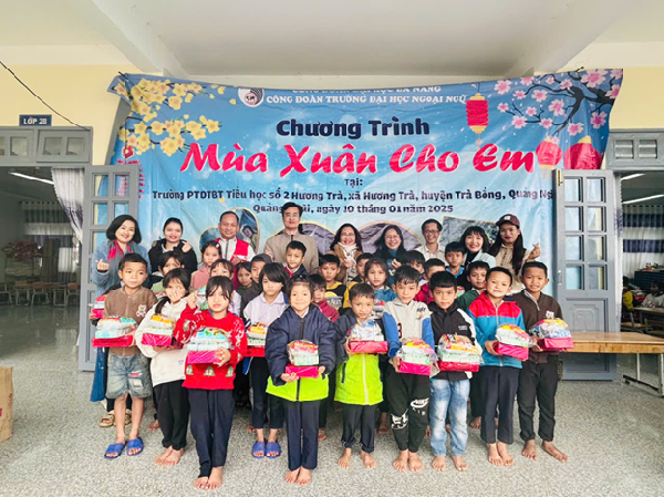 + Công đoàn Trường ĐH Ngoại ngữ: tổ chức Chương trình “Mùa xuân cho em” tại trường Phổ thông dân tộc bán trú Tiểu học số 2 Hương Trà, xã Hương Trà, huyện Trà Bồng, Quảng Ngãi: trao tặng 80 suất quà (trị giá mỗi suất quà là 500.000đ, bao gồm tiền mặt 400.000 đ/suất và đồ dụng học tập là các ram vở viết, bút mực, bánh kẹo, sữa tươi) với tổng trị giá 40 triệu đồng.